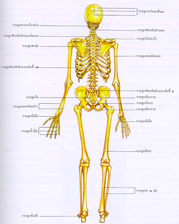 ๑. กระดูกลำตัว (axial skeleton) ประกอบด้วยกระดูกสันหลัง กระดูกอก กระดูกซี่โครง ๑๒ คู่ กระดูกกะโหลกศีรษะ รวมทั้งกระดูกขากรรไกรล่าง